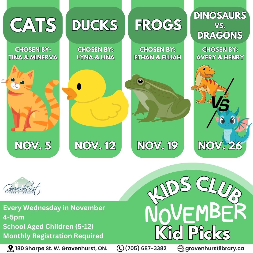 Kids club In November, Kids Club is all about Kids Picks! Local library kids shared their favorite themes, and we’re bringing them to life. Minerva and Tina chose cats, Lyna & Lina picked ducks, Ethan and Elijah requested frogs, and Avery and Henry wanted the ultimate showdown: dinosaurs vs. dragons! Each week we’ll dive into stories, crafts, and activities inspired by our community’s very own young readers.