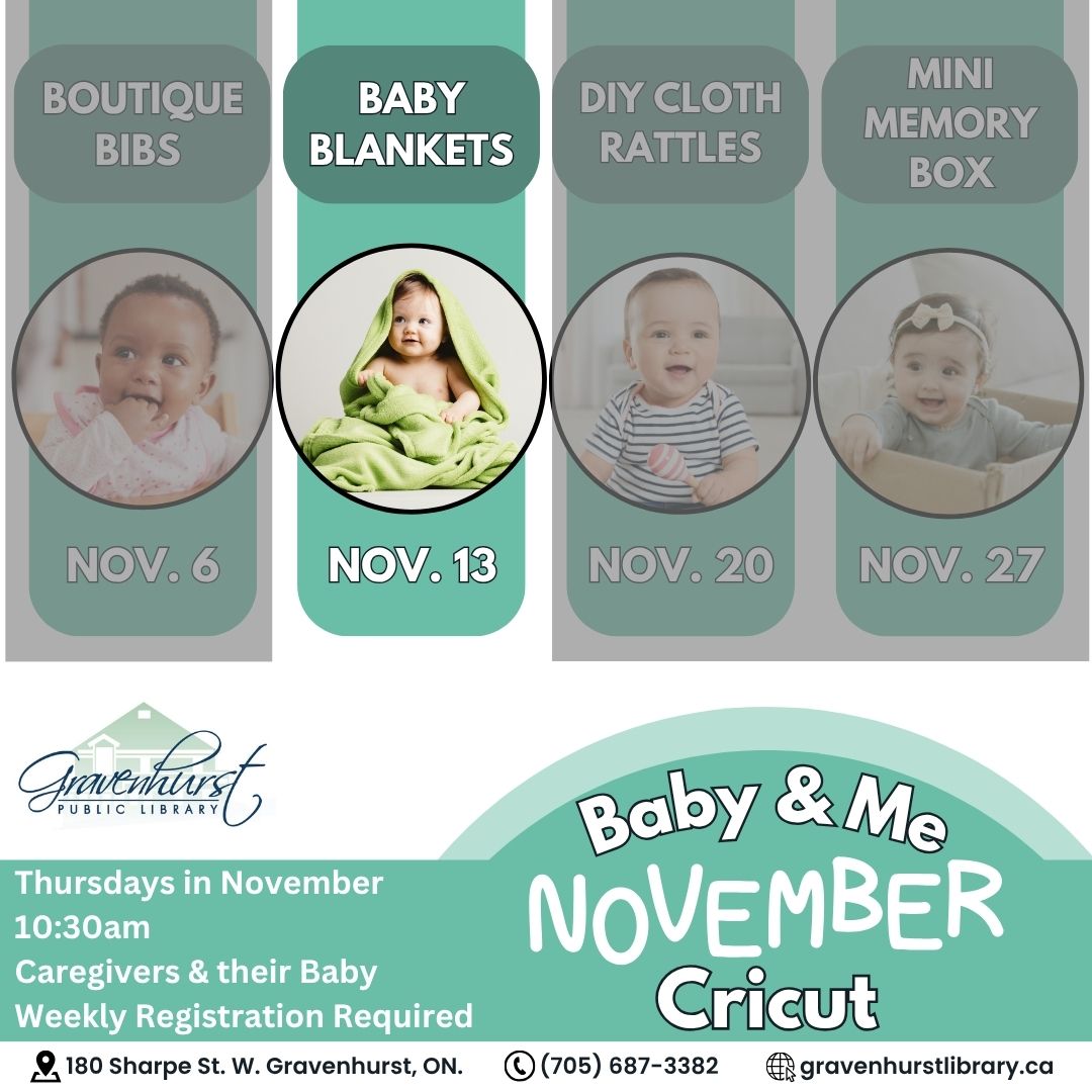 Caregivers and their little ones are invited to Baby & Me Cricut. Each week, create a new hands-on project together, including boutique bibs, baby blankets, DIY cloth rattles, and mini memory boxes. Enjoy quality time, creativity, and keepsakes you can treasure forever! Thursdays in November | 10:30am - 12pm Ages: Baby & Caregiver *Weekly Registration Required Bring your own device or use a Library iPad