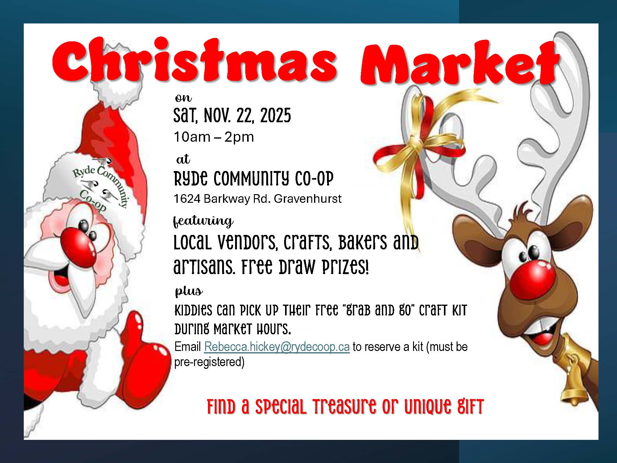 NOTE: Kids can pick up their free Christmas craft during market hours (must be registered in advance with Rebecca.hickey@rydecoop.ca)