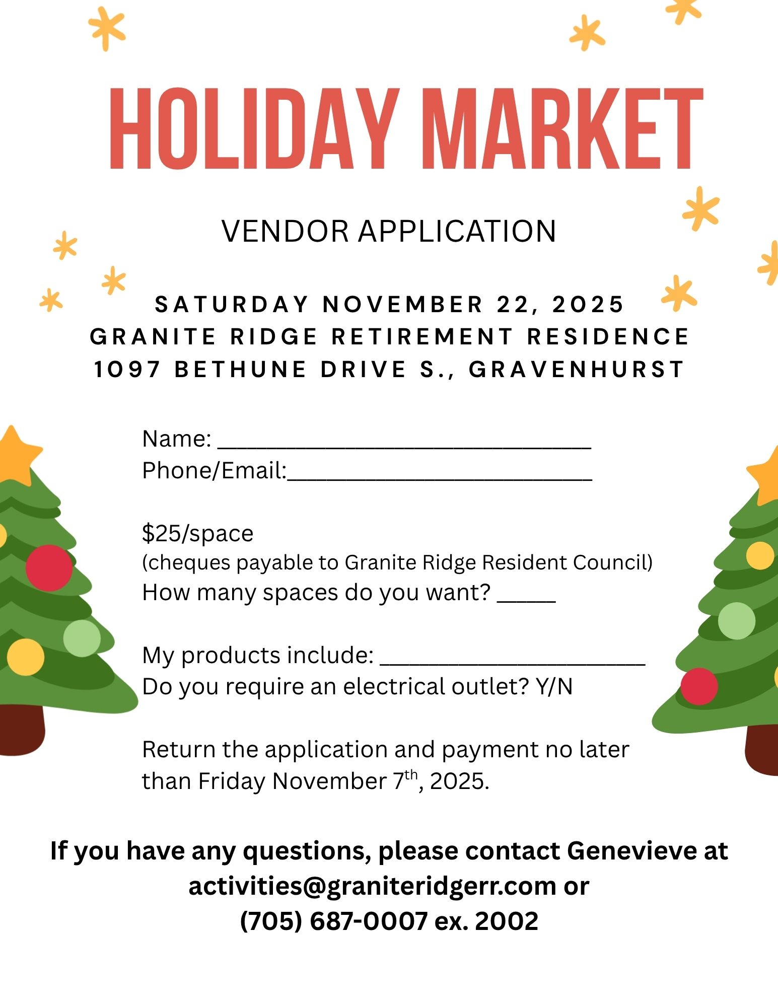 Join us at Granite Ridge Retirement Residence for a Holiday Market on Saturday November 22nd, 2025! You will find quality products, unique gifts, homemade goodies and a silent auction. Come by between 10am and 2pm.